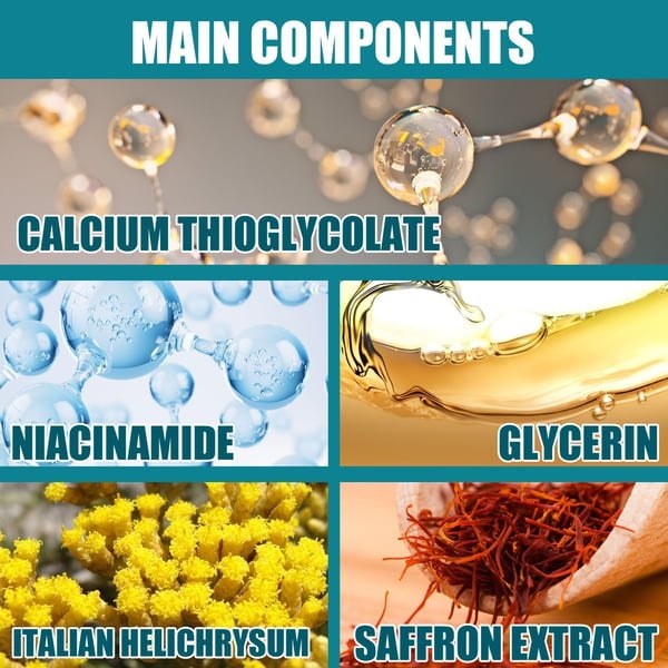 - Core ingredients: Calcium thioglycolate, Stearyl alcohol, Niacinamide, Glycerin, Italian helichrysum, Bisabolol, Yeast extract, Saffron extract, Panthenol